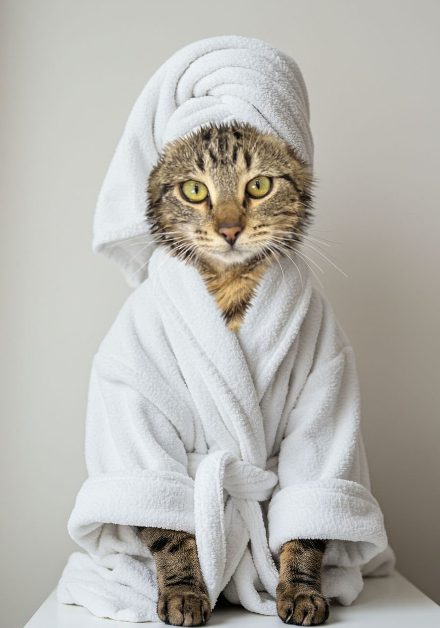 This is an older edit, so I don’t have the original request notes, but it was pretty straightforward. The OP provided a sample of the popular bathroom art photos where you get your pet photoshopped into a towel and/or bathrobe, along with a few photos of the cat.