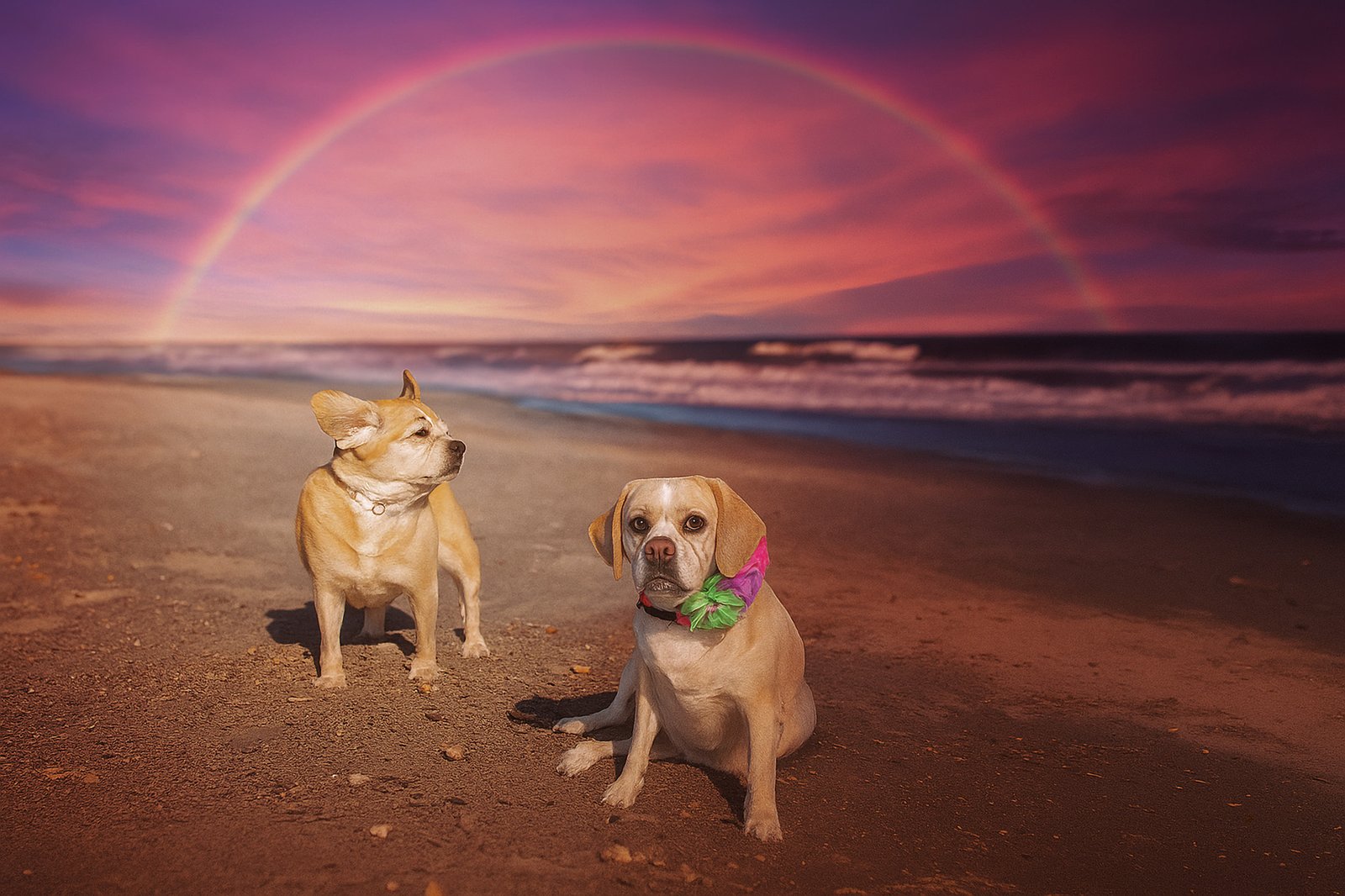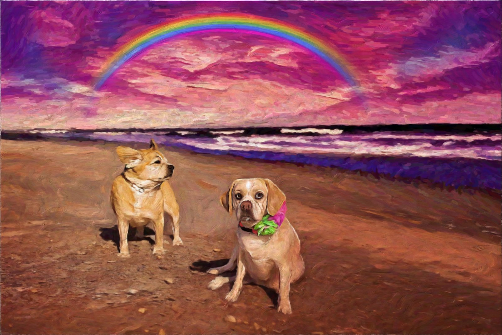 The first thing I did was edit the photorealistic version of what I wanted to paint, expanding and outpainting it to make more room. I added a sunset and rainbow to the sky, and then added in the second dog with shadows that matched the new background. Once the photoreaslistic version was complete I gave the whole thing an oil paint treatment!