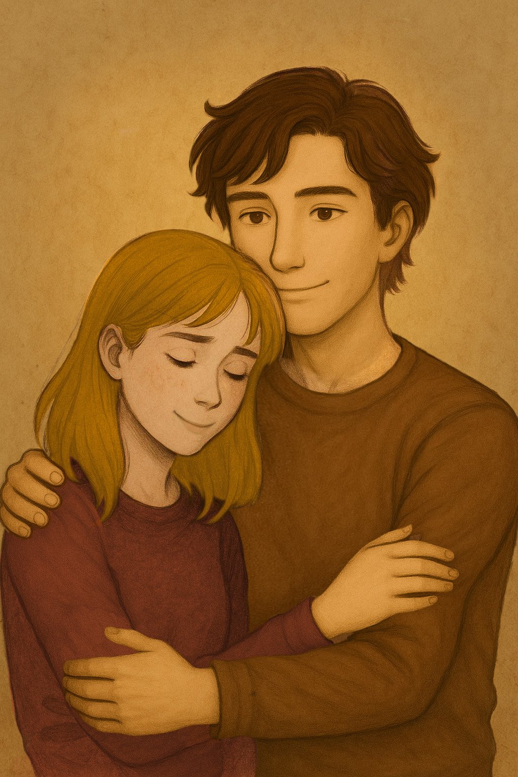Is anyone able to give the girl blond hair and a soft smile. Can you give the boy his other eye. And if possible put both arms around the girl?