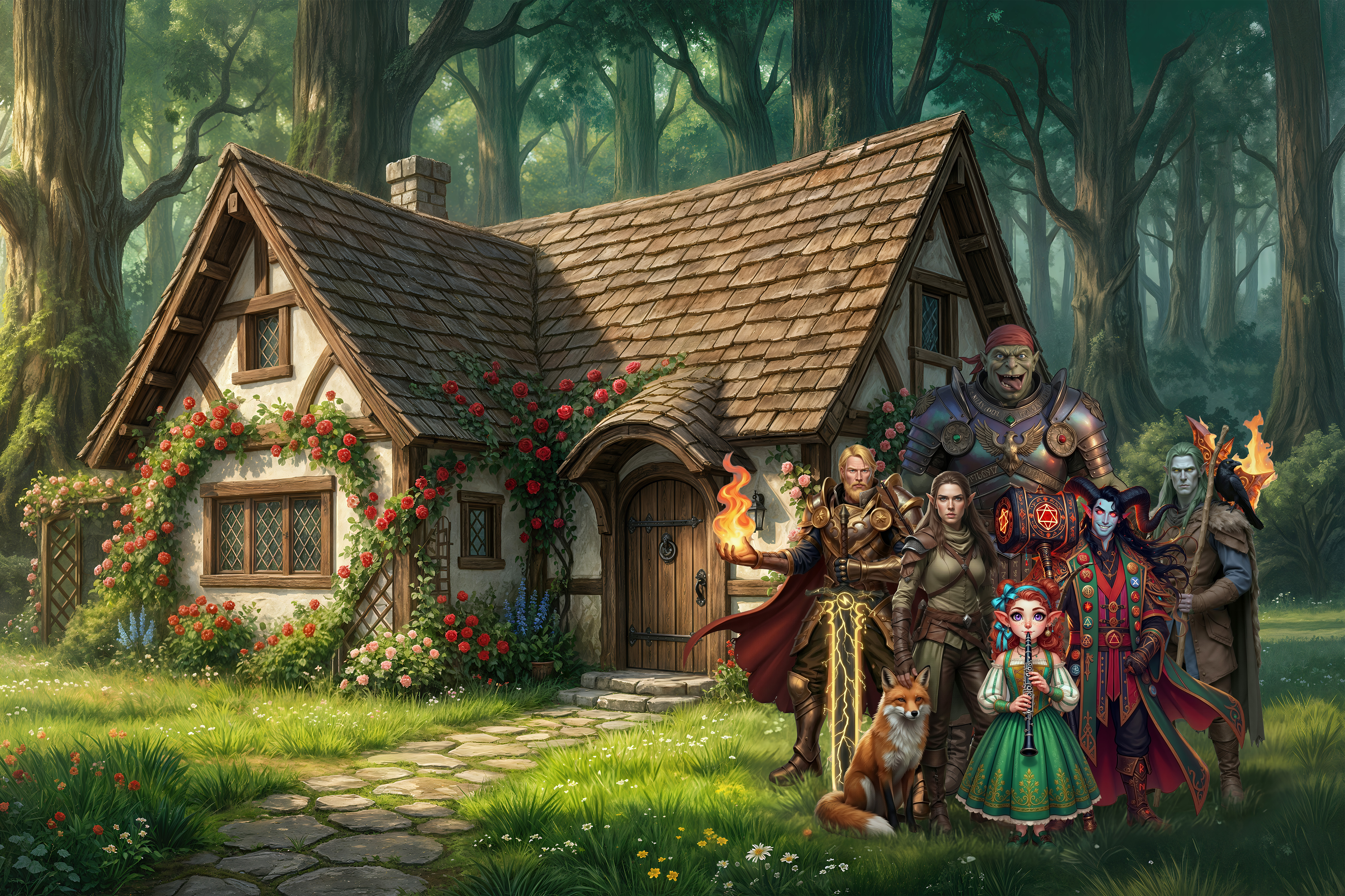Create a picture of our D&D party in front of a cottage in the woods