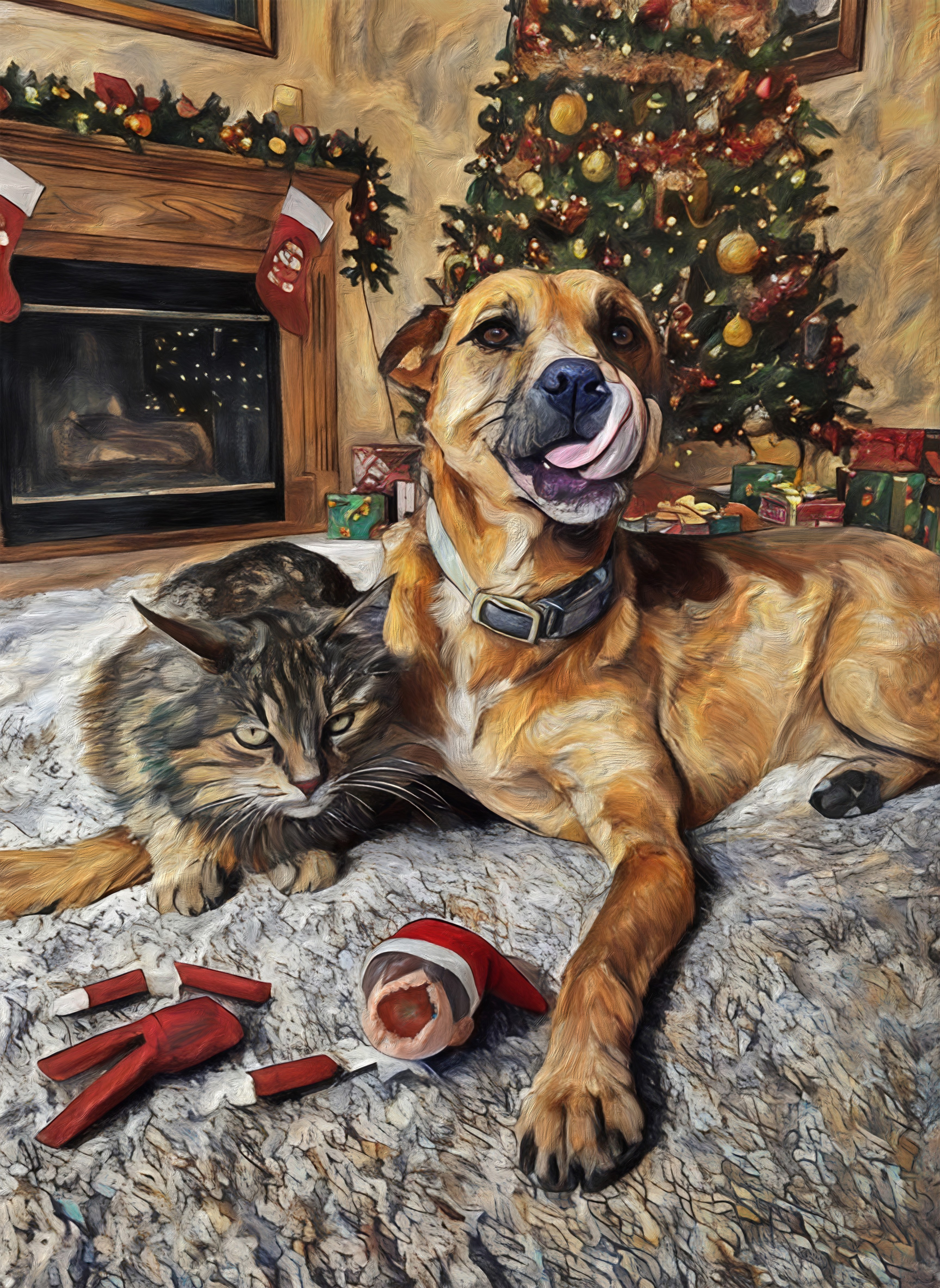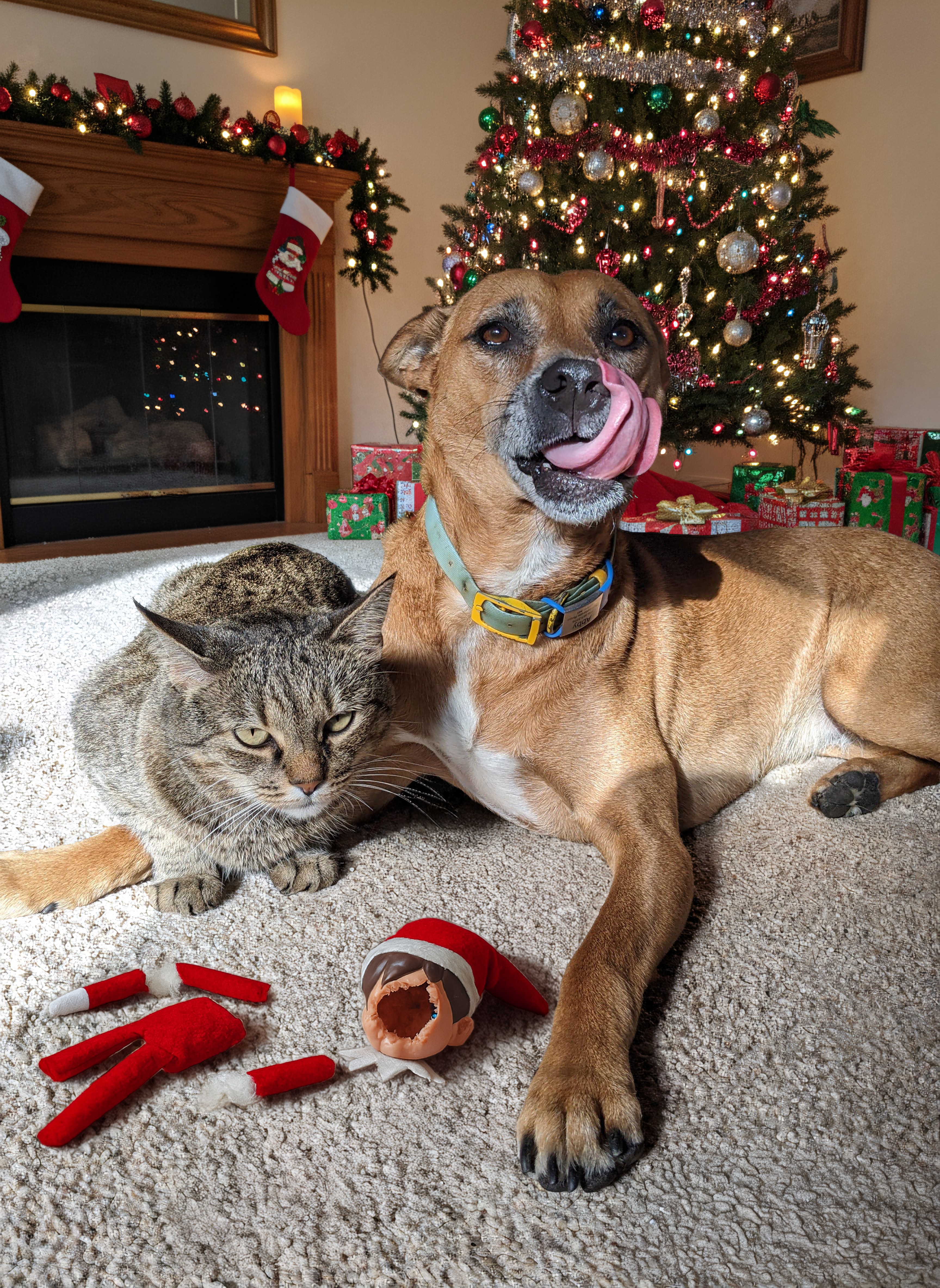 The requester wanted to make it look like his pets had destroyed an “Elf on the Shelf” to use for a Christmas card.