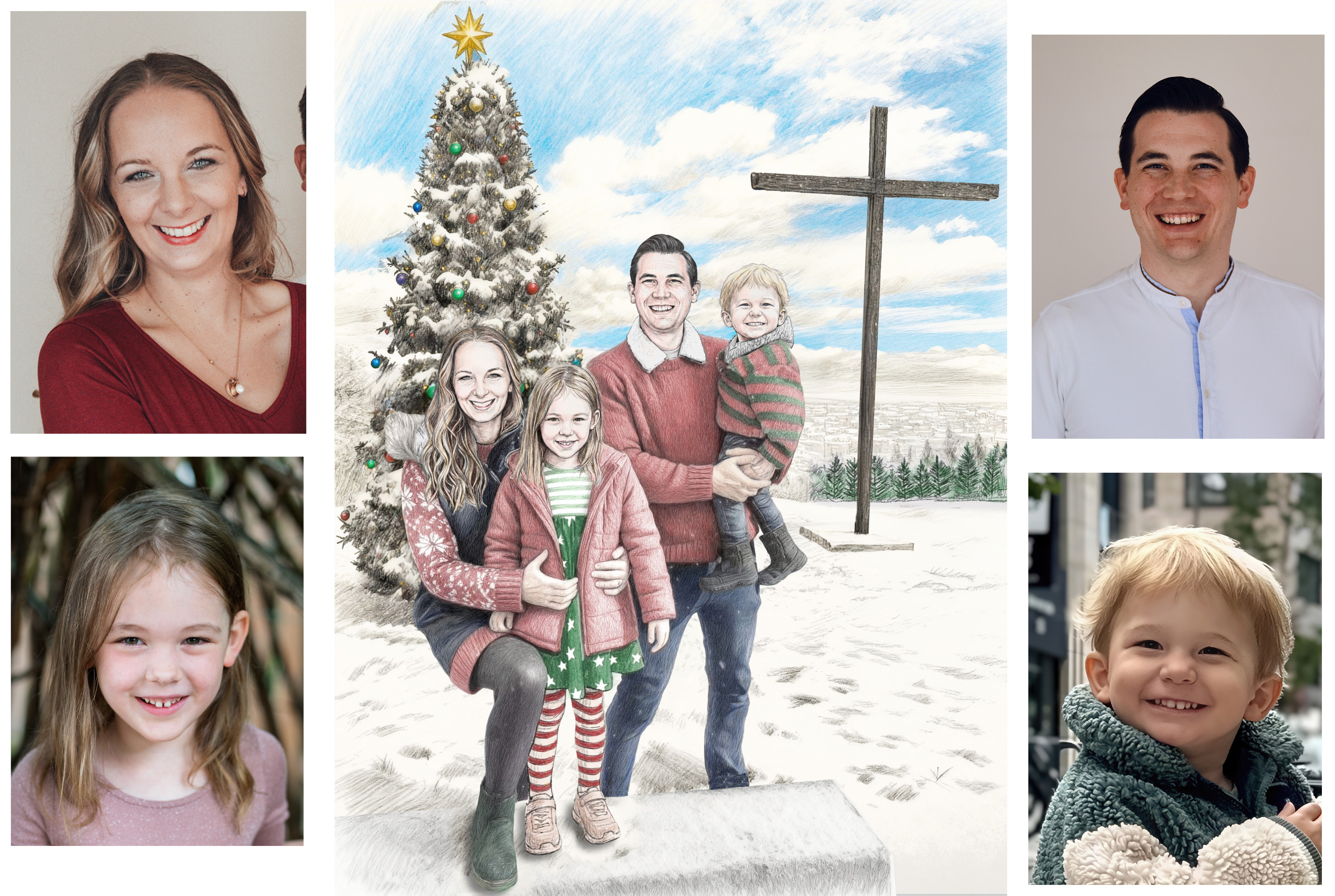 The family photo they wanted to use was a great pose and location, but the requester was not happy with their faces and wanted them all changed. The pictures you see here are the ones that we ended up choosing, but I actually made this second set when they were not happy with the first faces they chose. The original set of photos for the parents were selfies, which weren’t taken at the best angle. The second set was lovely, however!