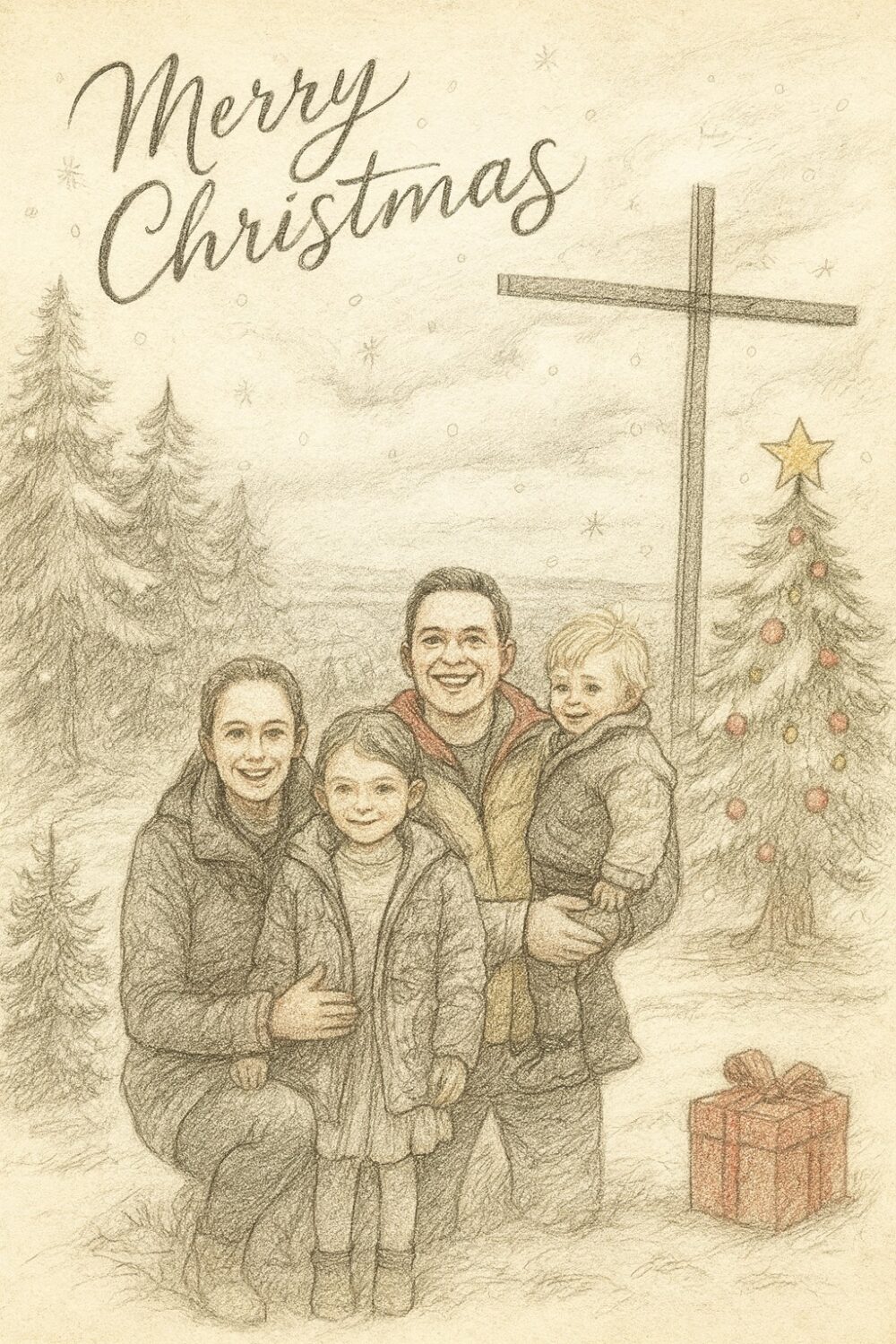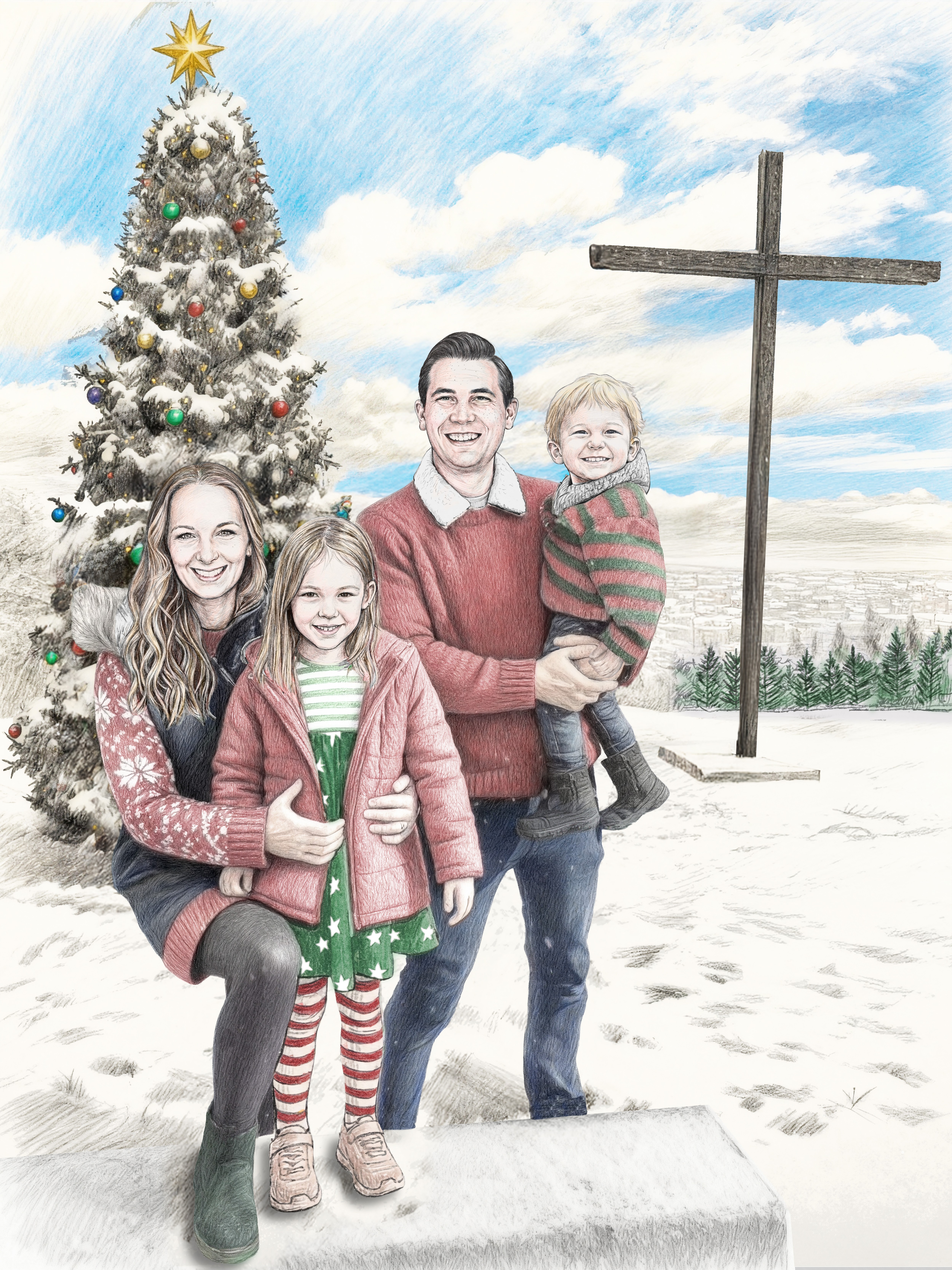 This requester had used an AI generator to try and make a colored sketch style Christmas card. As is often the case, they received an image that just didn’t look like them, and in this case, was significantly disfigured, with the father’s legs cut off at the knees. I suggested we start from scratch and they sent me some photos to work with.