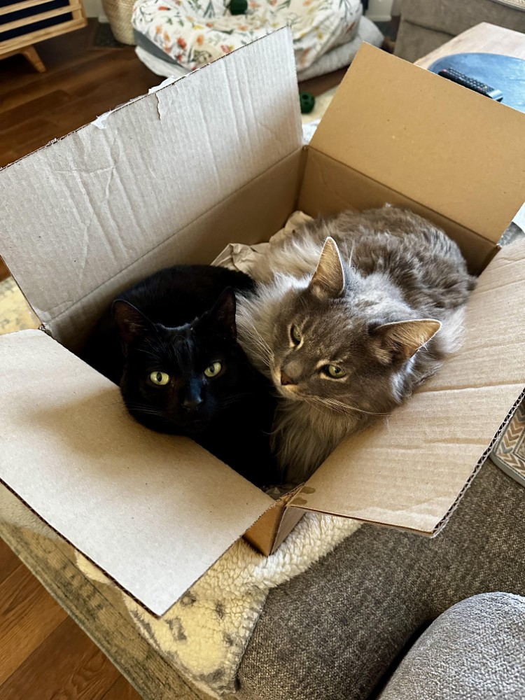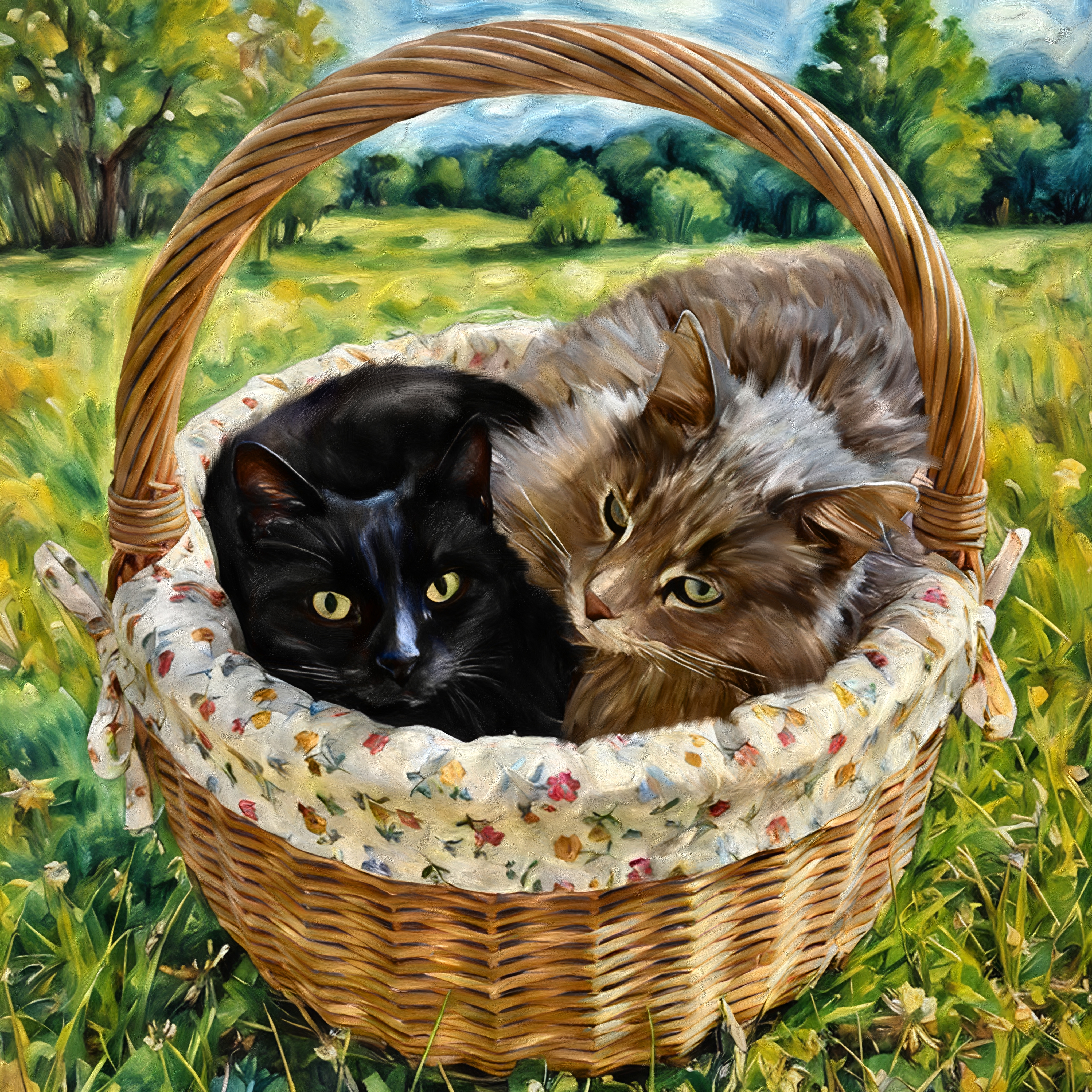 The requester loved this photo of their cats, but didn’t like the background, and asked to move them into a basket outdoors.