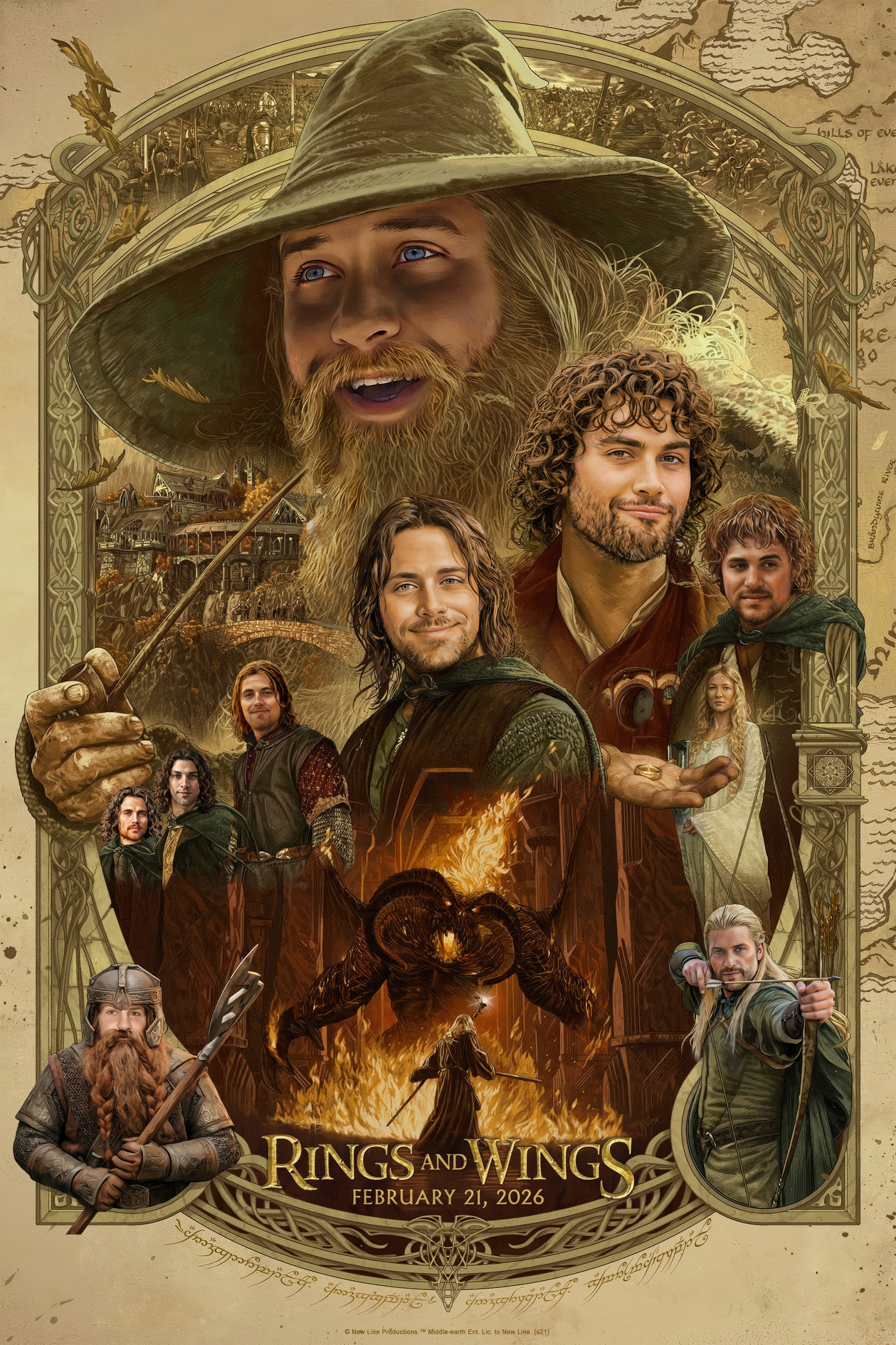 I need help putting together a poster for the event. If you can replace as many faces on this poster with their faces, that’d be rad! I’ll add another $5 if you replace “The Lord of the Rings” with “Rings and Wings” in a similar font, and “The Fellowship of the Ring” with “February 21, 2026”
