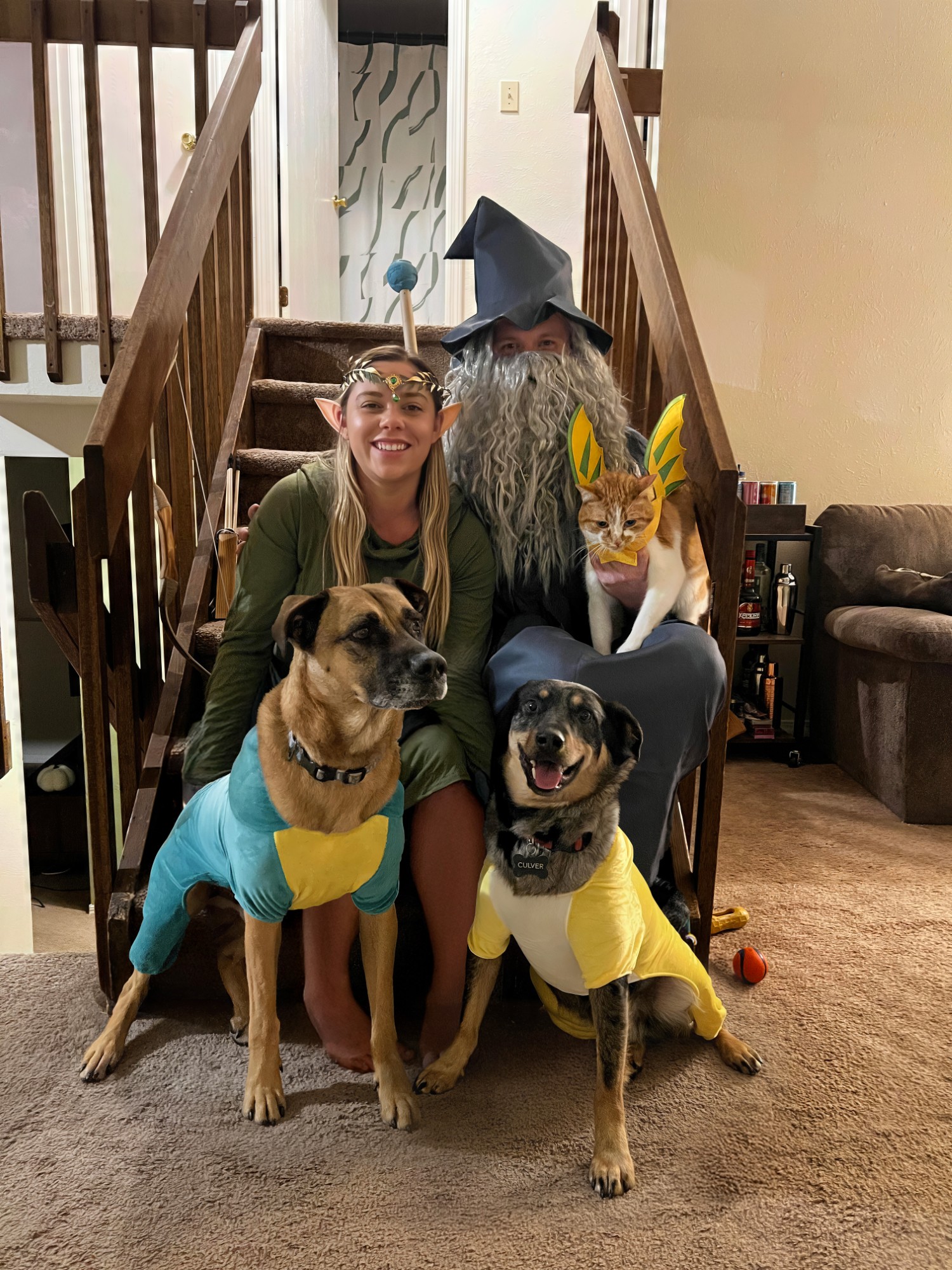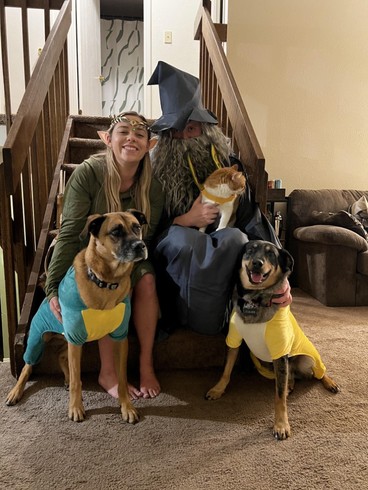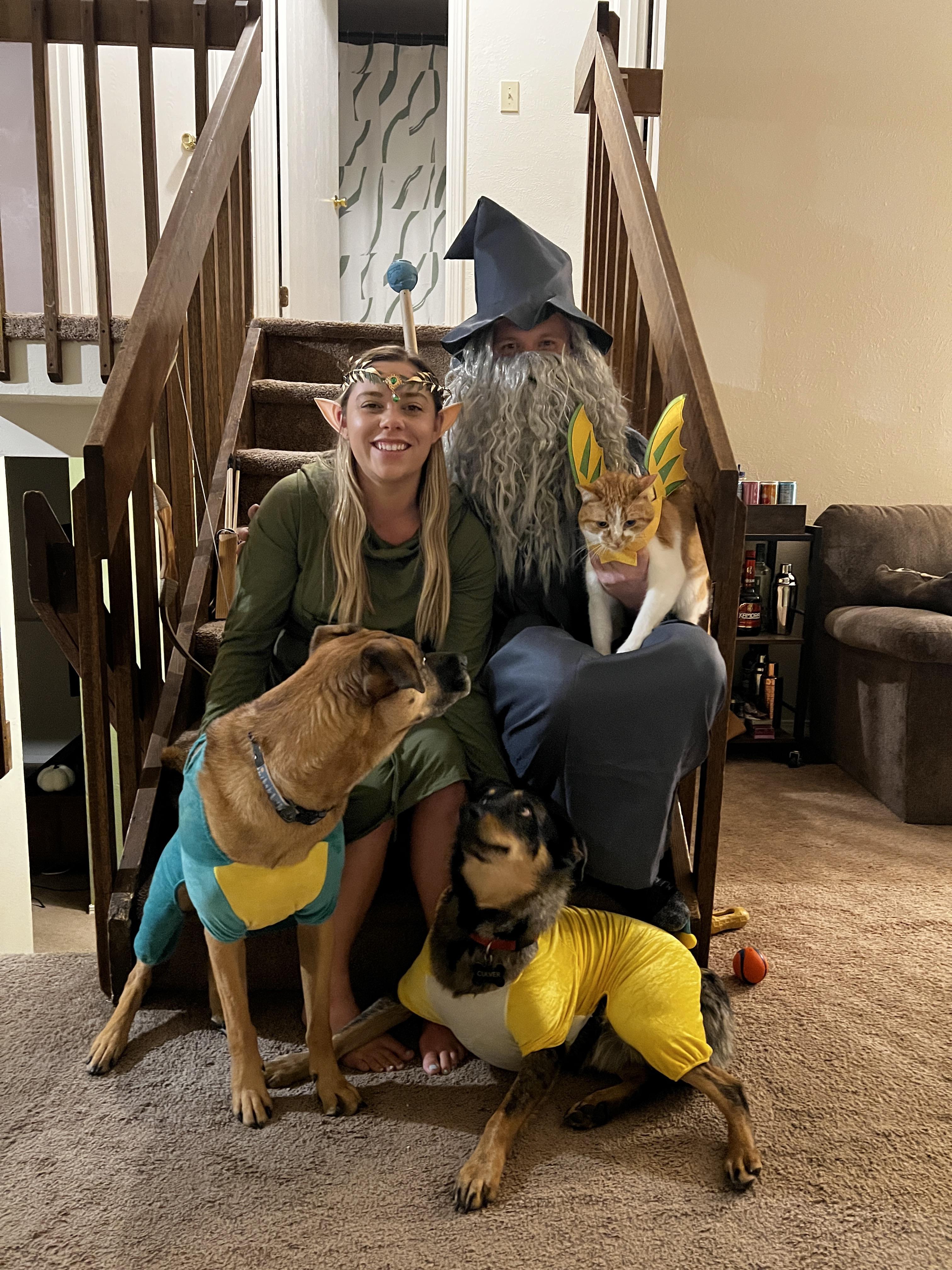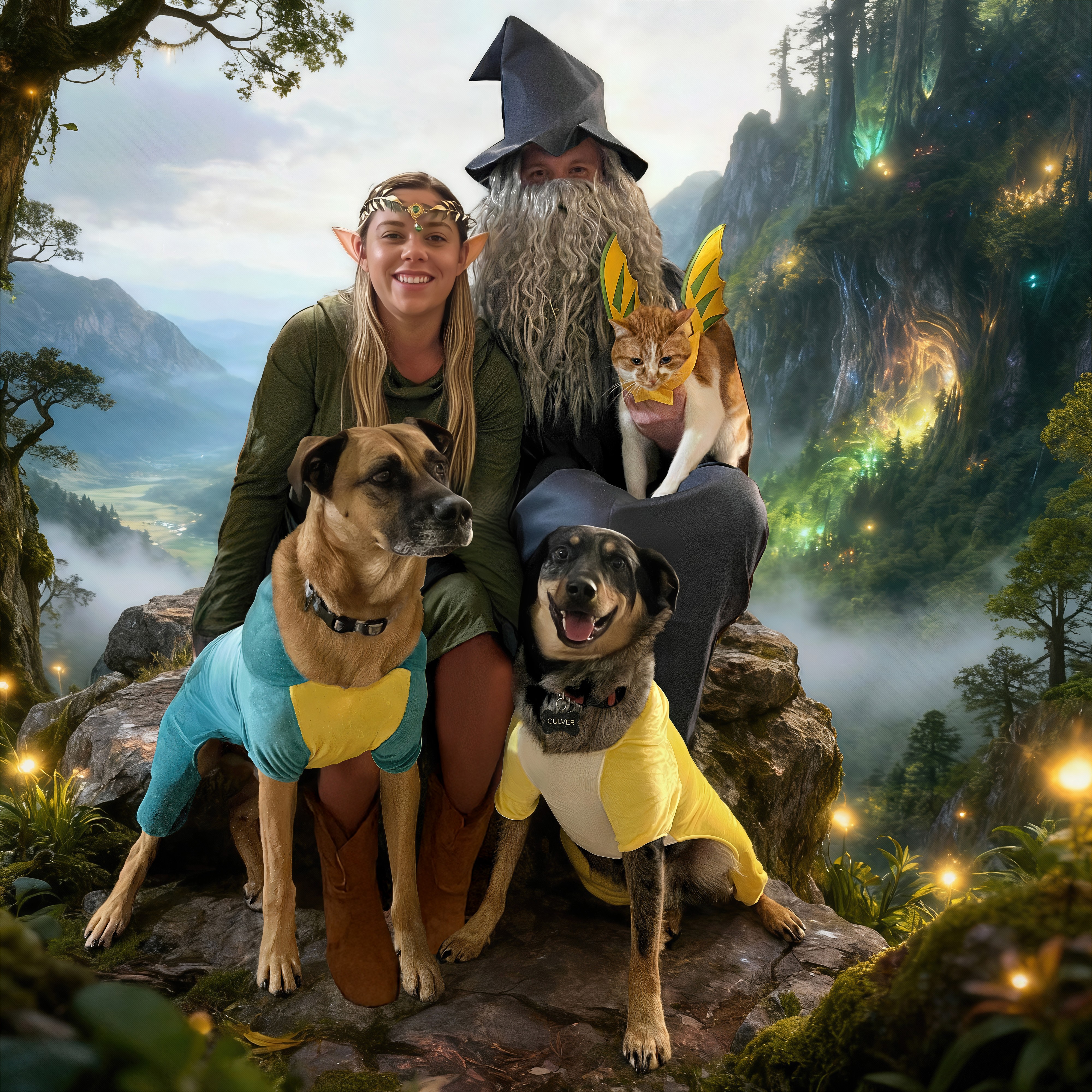 Swap the dogs in image 1 onto image 2 so that everyone is facing the camera at the same time. Then make a second version with a fantasy themed background.