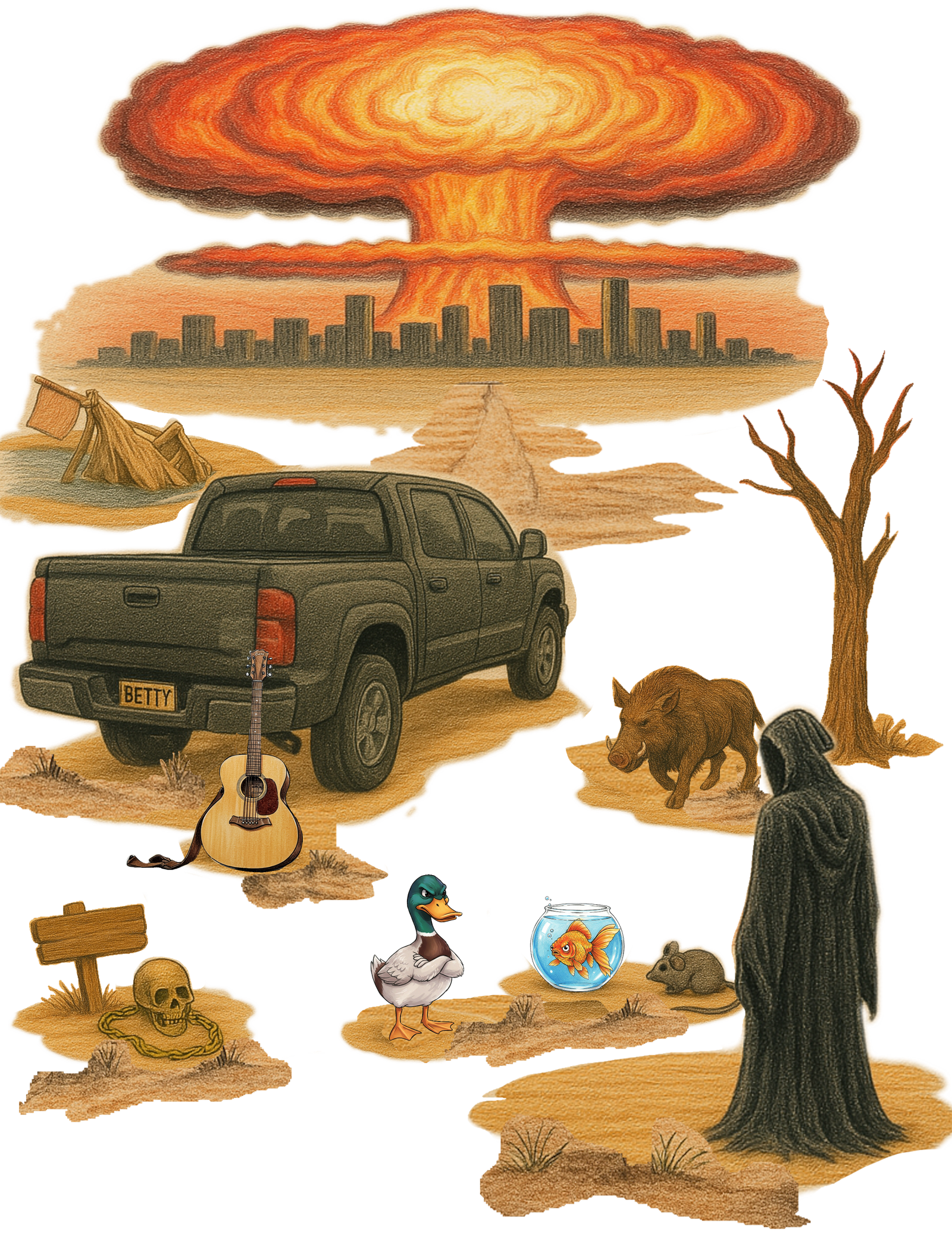 I never actually complete this edit, because OP chose another editor before I finished. But I thought it was a really neat image, so I kept it anyway. There are a few elements in the image (duck, fish, guitar) that are not yet transformed into the grainy illustration style that I chose to work with. It is one of my favorites, what ChatGPT considers a “colored pencil sketch”, which I thought would be appropriate since the original image was also colored pencil. I also had not added any of the text yet. As, requested, I kept each section on it’s own little island of sand so that there would be no defined outline to the image when printed on a shirt, though I am not sure how I feel about that, LOL.