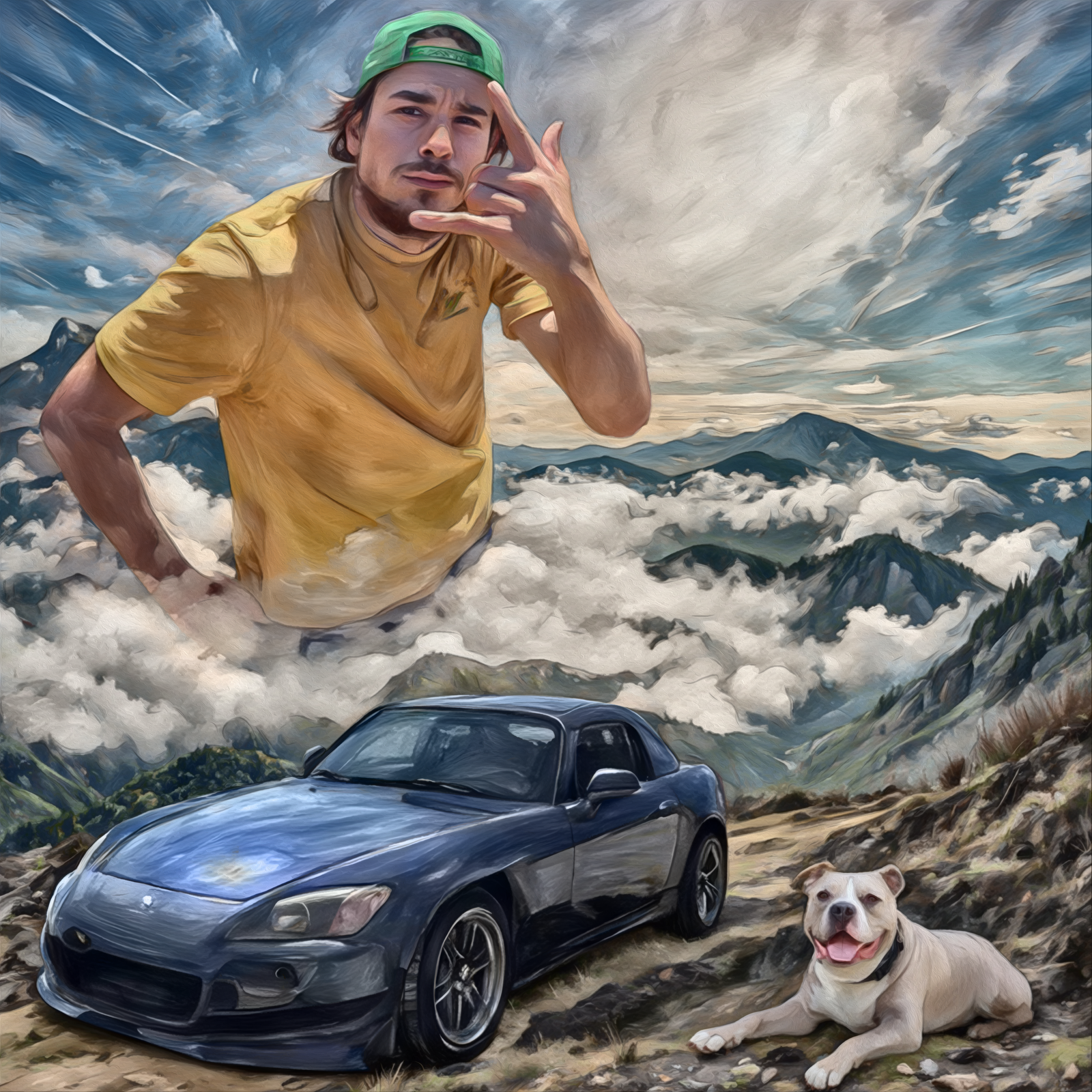 First pic is what I’m looking for as a final result, but I need the picture of him with the green hat and yellow shirt instead with the bandaid removed. Third picture is his actual car, would like that to be the car in the poster. 4 picture is the picture of his dog that would be preferred. If other pictures are needed please PM me. Thank you