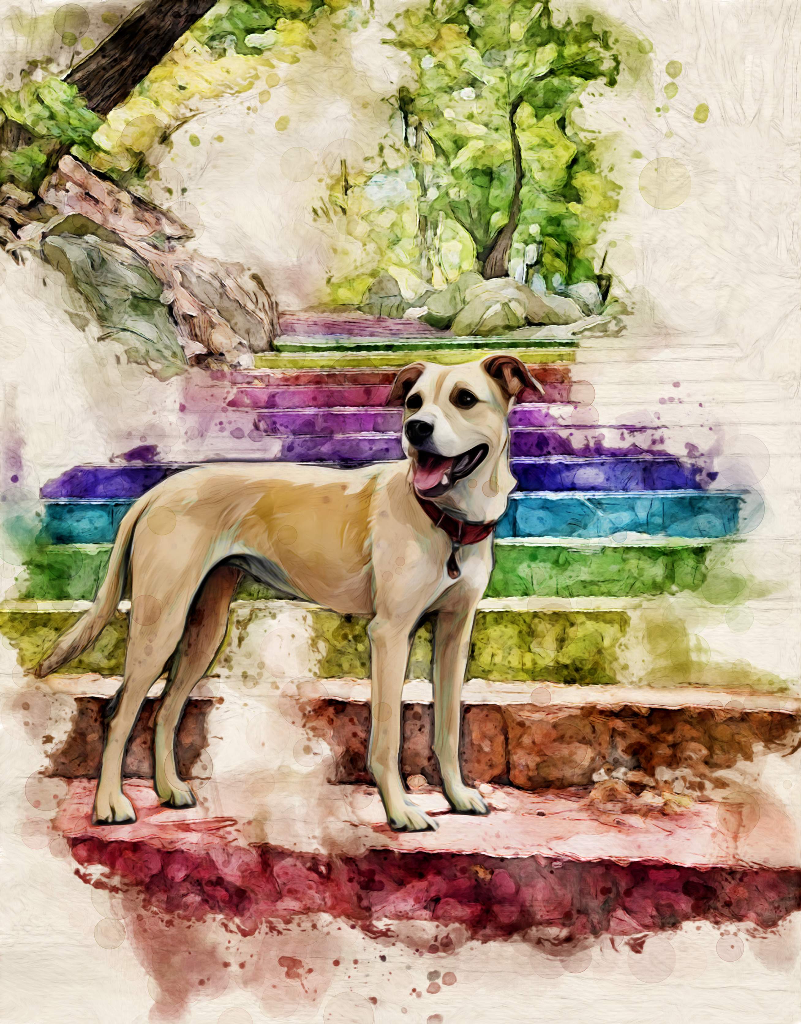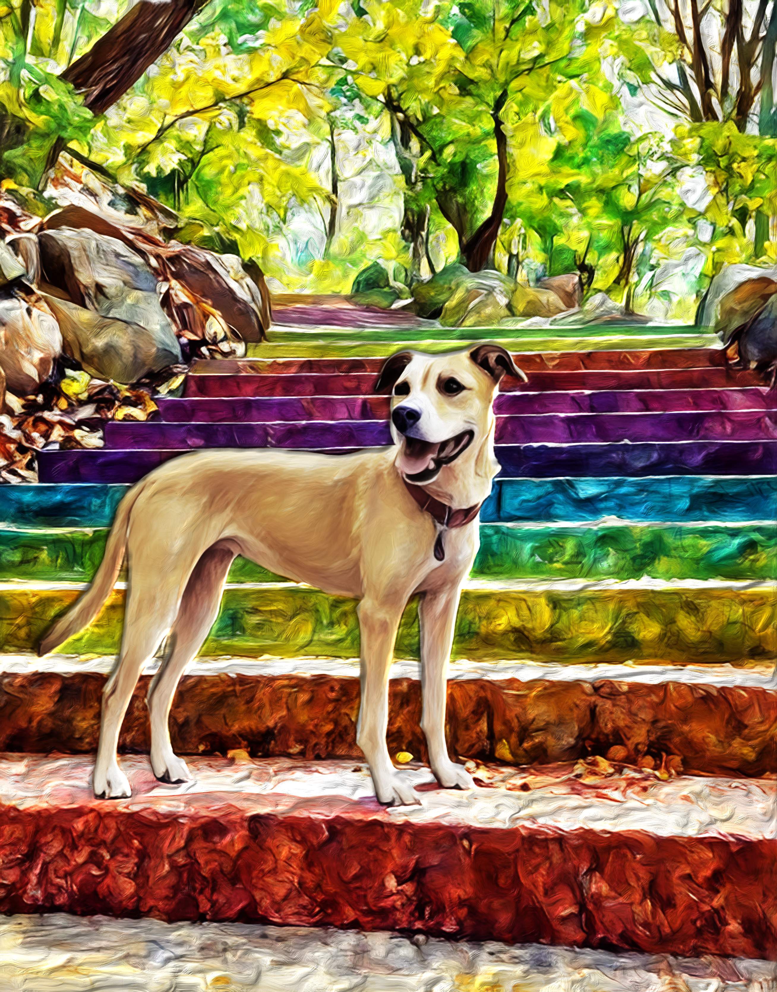 Since this was a memorial, I thought I would use the “Rainbow Bridge” concept, but with stairs! So I tinted each step with the colors of the ROYGBIV spectrum. And then of course, turned it into an oil painting and a watercolor.