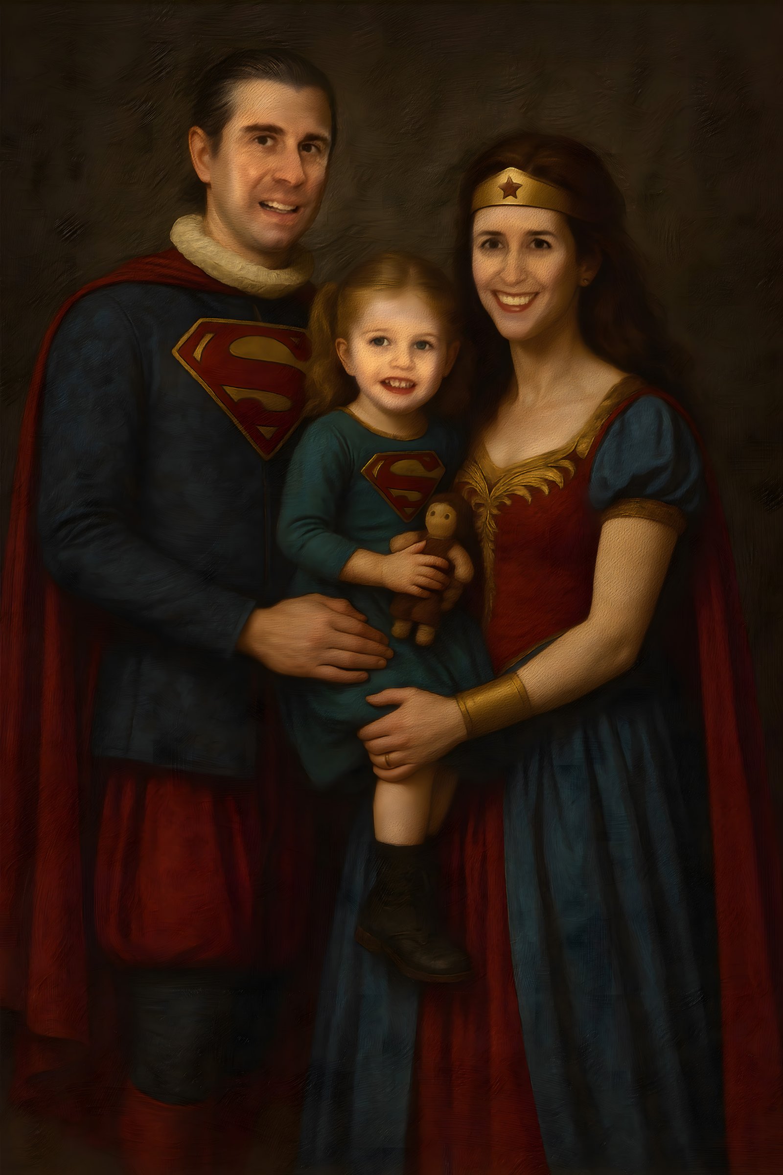 Armed with multiple examples of superheroes dressed in Renaissance garb, I was able to get ChatGPT to create a nice painting mimicking the poses of the family photo, and the style of the Sacha Goldberger paintings. Then of course, because ChatGPT always changes the faces too much, I added in the real photo faces of the family. Then to blend it all together, I took the image into Corel Painter and painted the whole thing.