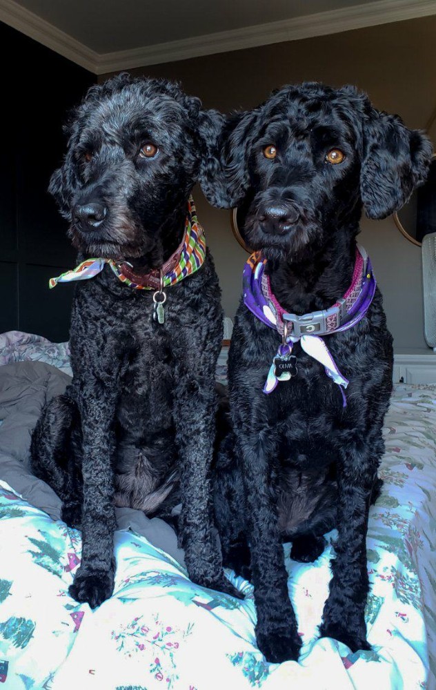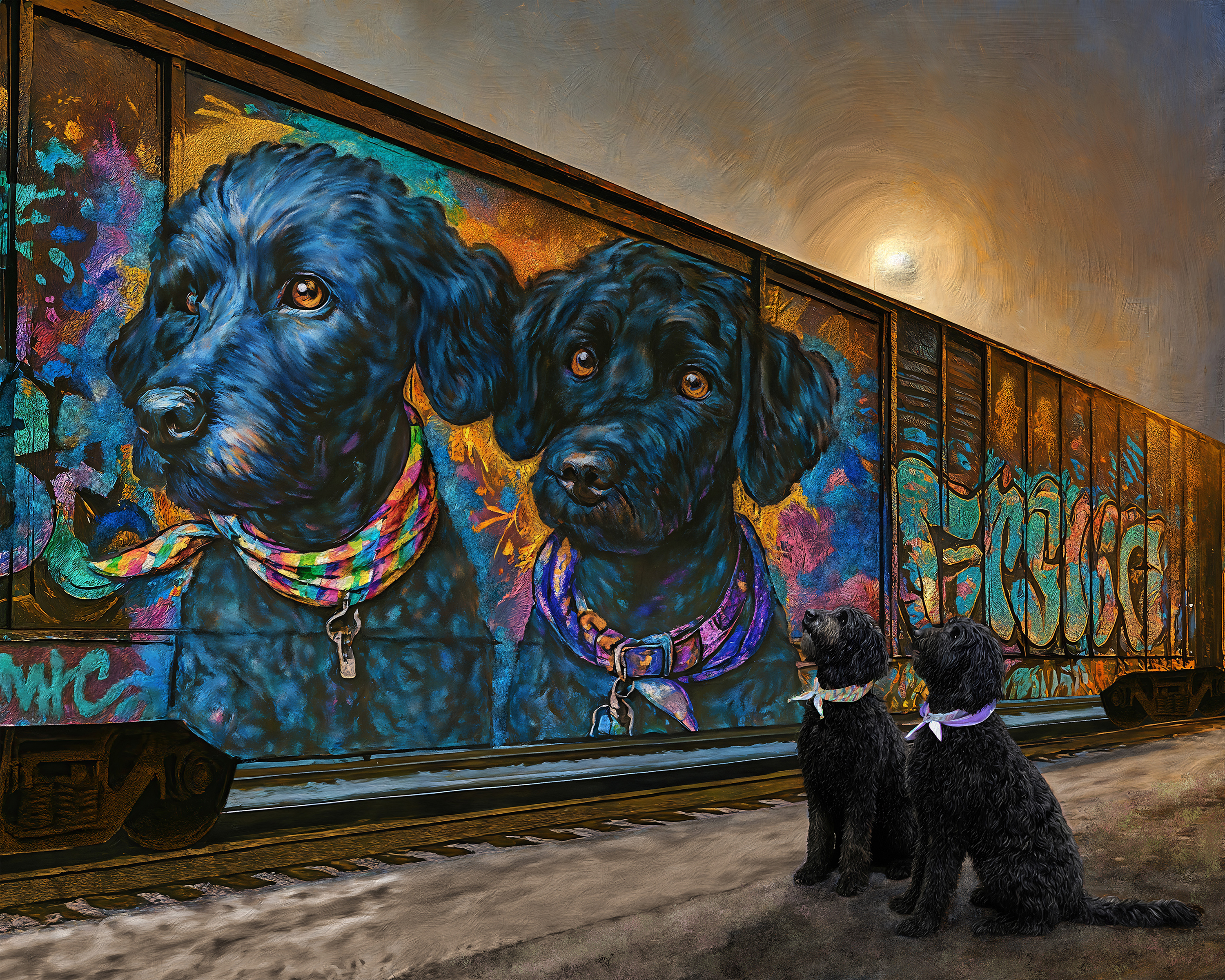 This request was extra special, since it was coming from another editor. Their specialty is photo editing rather than artistic, so they asked me to help with a Christmas gift for a friend who works at a railyard and has two black goldendoodle dogs. She wanted an image of the two dogs, staring up at a grafitti-covered traincar that features a painting of themselves.