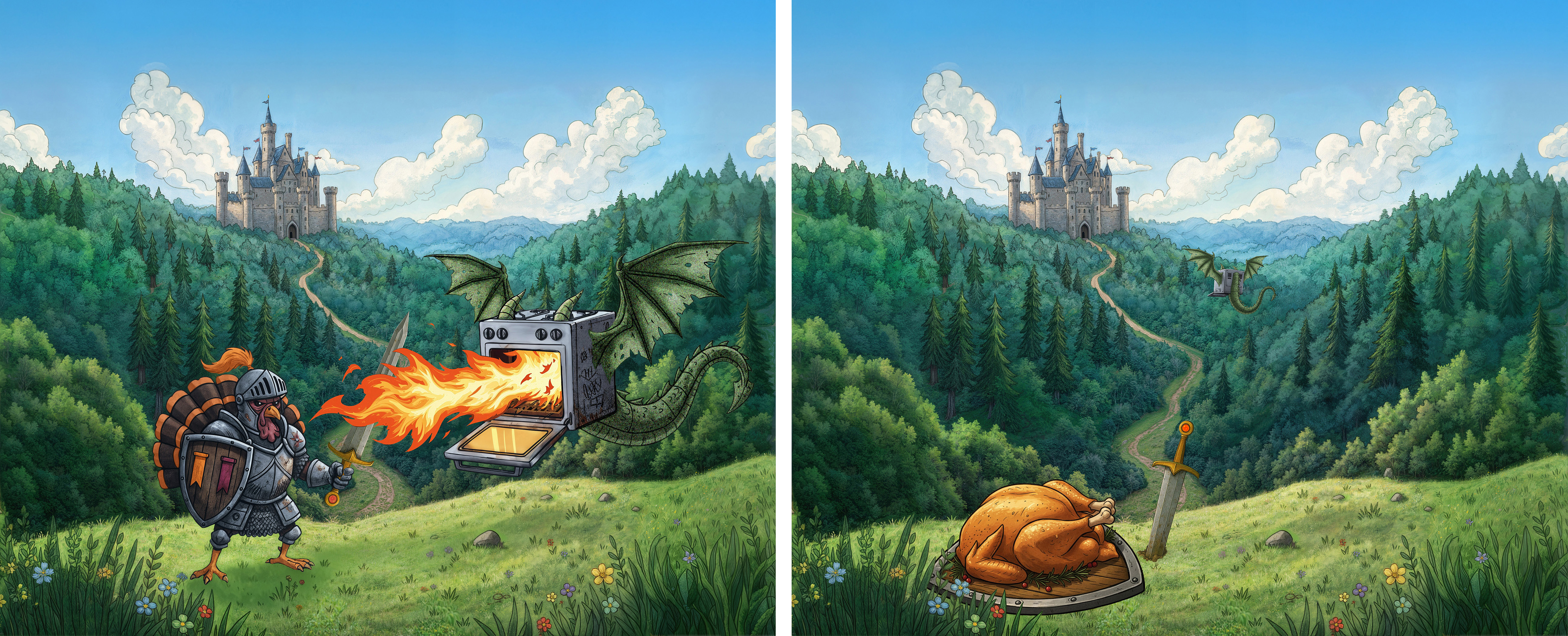 This year my son asked me to design a humorous greeting card idea he came up with to celebrate Thanksgiving here in the USA. Pretty much everyone in the States eats turkey for Thanksgiving, so he wanted a cartoon of a turkey and an oven doing battle, with the turkey dressed as a knight, and the oven made to look like a dragon.